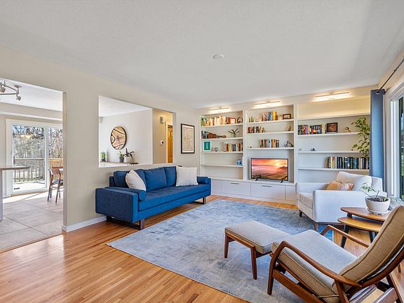 floors, picture window and beautiful built in bookcases. The open concept living space extends to the kitchen and dining rooms. The kitchen features ample storage, stainless steel appliances, newly tiled floors and a breakfast bar. Walk out to the deck from the dining room. Two spacious bedrooms are on the main floors, both with walk in closets. The full bath on the main floor is tastefully