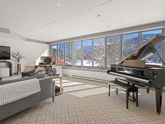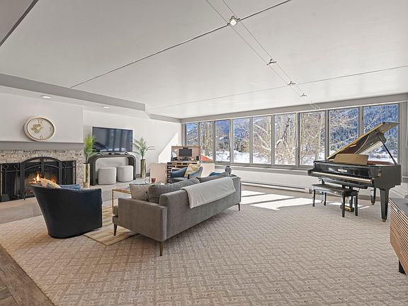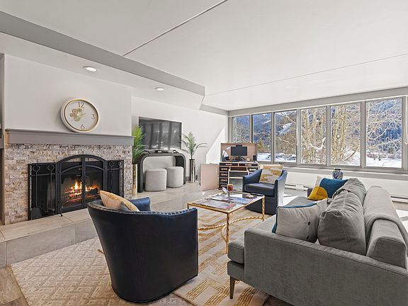 The airy great room is the perfect spot to gather in front of the wood fireplace after a day on the slopes. The expansive wall of windows provides stunning mountain views and floods the room with natural light. Gather round the dining room table in the formal dining area which opens to a modern kitchen featuring stainless steel appliances and granite counters.