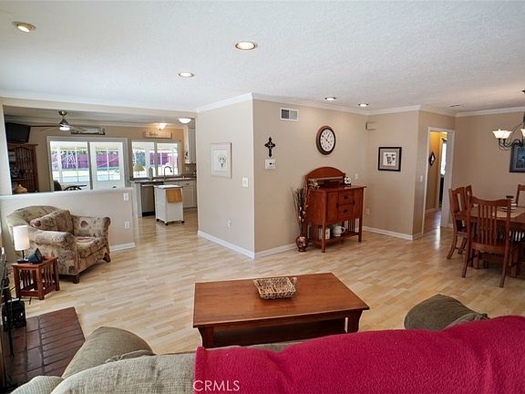 open floor plan with wood flooring and has pride of ownership! Open living room to formal dining area accented with wood flooring and a red brick fireplace for cozy fires. The living room is accented with large windows and in dining area for natural lighting to enjoy! The kitchen is open and spacious and features dining area with a tv to enjoy shows while you cook.The kitchen features Corian countertops and white cabinet with glass cabinet to feature your special stemware and a corner cabinet with a lazy Susan interior for extra pots and pans and small appliances and Stainless steel appliances with refrigerator included.The service pantry includes stackable washer dryer and easy access to the HVAC system and an additional cabinet for extra storage. The bedrooms are separate area of home. The spacious primary bedroom has neutral color with crown molding and a mounted TV. Spacious wood shutter wall closets and wood flooring. The primary bathroom has a new vanity and a large walk in shower. The secondary bedrooms are spacious with wood flooring and spacious closets. The middle full bathroom is shared by secondary bedrooms. The perfect place to enjoy your day is in the enclosed sun room year round with tile flooring and large windows brings in natural lighting. Step out to the covered outdoor patio all ready for you to entertain with large TV to enjoy sport games. The large 2 tiered yard is beautiful and has newly painted retaining wall and back wood fencing.The large spa is perfect to enjoy and relax and watch the stars on a summer night. The beautiful trees and the rose garden is gorgeous with a variety of pretty roses to enjoy! The home is located in a cul de sac and has front RV parking for your RV needs. Home is near schools and shopping and Central Park for fun summer events to enjoy! Perfect home for you !!!