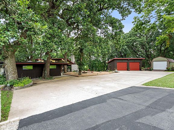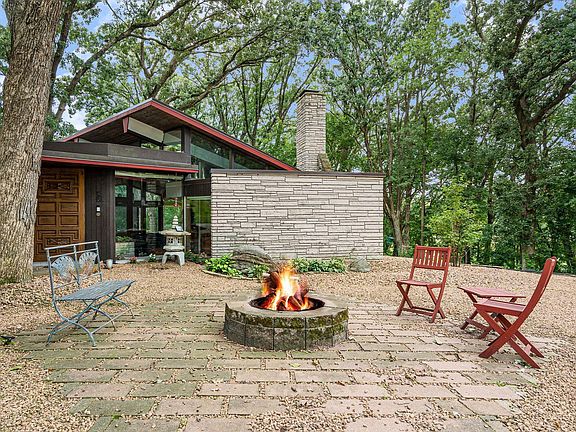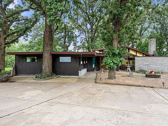 Welcome to this architectural masterpiece, a Frank Lloyd Wright inspired residence that blends timeless design with modern elegance. Meticulously cared for, this one-level home showcases an expansive open layout where the kitchen, dining, and living areas flow seamlessly together, centered around a striking limestone fireplace and enhanced by terrazzo flooring. Every detail reflects quality craftsmanship, from the custom finishes throughout to the thoughtful integration of natural elements that bring the outdoors in. Set on a stunning 1.65 acre lot, the property offers a serene and private retreat complete with a beautiful patio framed by handset Japanese stones that continue into the bathroom, creating a unique sense of harmony. Surrounded by mature trees, the setting is as peaceful as it is impressive, while a detached double garage adds both convenience and functionality. With its thoughtful design, remarkable finishes, and unmatched setting, this home is truly one of a kind.