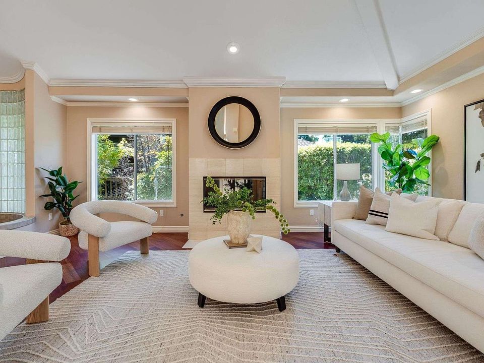 Custom home with amazing views, featuring 4 bed, 3.5 bath, plus an office, offering 3,010 sq. ft. of living space on a 7,612 sq. ft lot. A sun-drenched entrance, announced by a stately classical column, leads to the formal entertaining spaces set over hardwood floors. Soaring ceilings as you enter the living room with fireplace open to dining area with vaulted ceiling, & built-in wet bar. A private office/den boasts its own fireplace. The open-concept great room combines a chef's kitchen, dining nook, & family room with floor-to-ceiling built-in bookshelves. French doors open to a balcony with hillside views. Primary suite is a spectacular retreat with dramatic vaulted ceilings, skylights & walk-in closet. Sliding doors open to a balcony with expansive views. Updated spa-like ensuite is beautifully appointed with double sinks, freestanding tub, & tiled stall shower. Spacious secondary bed & full bath located on the second floor. The lower level features a spacious living area, two additional beds, full bath & access to a ground-level paver patio. Located near Blackberry Farm, McClellan Ranch, and Fremont Older Open Space Preserve, this home combines picturesque views, easy outdoor access, and top-rated Cupertino schools for the best of Silicon Valley living.