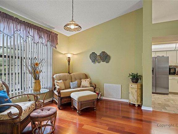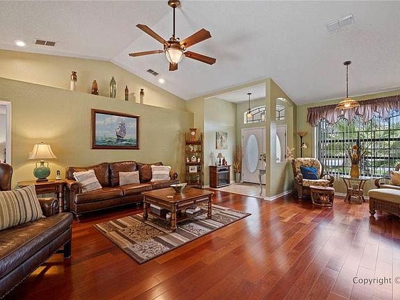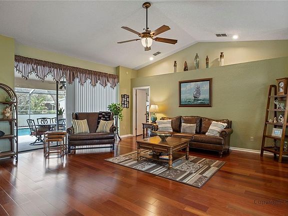 Located on a quiet block in Spring Hill FL this home does not disappoint, from being located central to many amenities to the home itself. Landscaped with luscious palm trees the property is eye catching. As you walk through the French front doors you will be greeted by impeccable Brazilian hard wood floors throughout the majority of the home, including the closets! The wet areas of this home are tiled. The living room with vaulted ceilings and sliders to the lanai feels light and airy and is great for entertaining. Currently set up as a seating area there is a flex area attached to the living room. Use it for extra seating or a dining room table. The living room, primary bedroom and breakfast nook all have access to the heated salt water pool. The kitchen has granite countertops with a breakfast bar for a quick meal or enjoy your meal in the breakfast nook that also over looks the pool. The laundry room is situated behind the kitchen with a full laundry sink/vanity and a large closet that can be used for storage or as a pantry. On the left of the home you have the guest bedroom and guest bathroom. This setup offers privacy to your guests. On the right of the home is the primary en suite. The en suite boasts a double vanity, stall shower with glass door and a soaker tub. Wake up and enjoy opening the sliders of your bedroom and stepping right onto the lanai. You can have a cup of coffee or take a swim in the heated pool. Ready to take a look? Give us a call today.