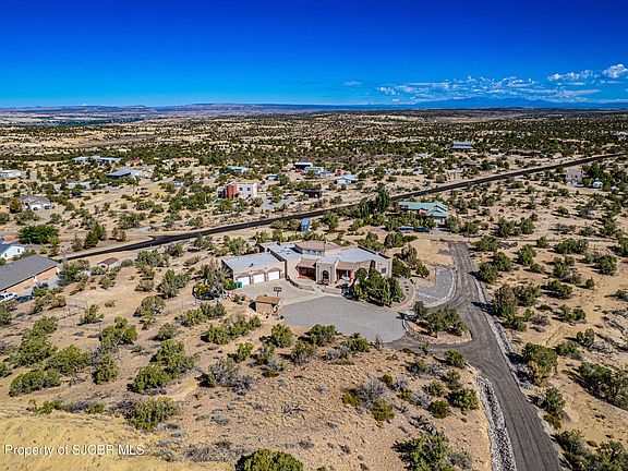 ''Lion's Share'' Exquisite Spanish-style estate on 2.5-acre hillside in N. Farmington w/ 270 panoramic views of the La Plata Mtns, Lukachukai Mtns, Chokecherry Canyon, Barker Dome & more. Less than 1 hr from Durango, this residence blends elegance, serenity & grandeur and features a heated saltwater pool.Grand entry w/ chandelier & soaring ceilings opens to a sunken den boasting 20' ceilings, carved stone gas-log FP mantle & dbl-door balcony access. Formal LR offers 180 views, FP & balcony. Chef's kitchen is a showpiece--marble & tile finishes, pro Jenn-Air 6-burner gas range w/ griddle & dbl oven, new SS fridge/freezer, dishwasher, microwave & trash compactor. Island w/ breakfast bar, wine/coffee bar & pantry-style cabinetry complete the space. Formal DR shines w/ chandelier & mountain vistas.Split floorplan gives the Primary Suite a spa-like retreat--private balcony, gas FP, oversized custom closet, power privacy screen, & en suite bath w/ dual sinks, make-up desk, 2-person tiled shower & jetted soaking tub framed by columns & views.Secondary BRs are spacious--one w/ French door courtyard access. Guest bath w/ dual sinks & tiled tub. Huge laundry rm w/ counters, cabinets & sink. Guest 1/2 bath. Oversized finished 3-car garage w/ storage rooms, shelving & workbench.Downstairs offers 2 add'l oversized BRs (1 w/ dual closets), full bath w/ tiled shower & soaking tub, plus a billiard rm w/ French doors to covered patio & resort-style heated saltwater sports pool and sun deck.Outdoors: new landscaping & driveway, shaded by mature trees & natural juniper, manicured lawn, trails, 2 lg wooden sheds, fenced yard, dog/chicken run, tractor/trailer access & rm to build a shop.Features: central vac, water softener, HVAC system, multiple gas-log FPs, balconies, high ceilings & mountain views from nearly every rm.This is more than a home--it's a private hillside retreat where every sunrise & sunset paints the sky across your personal mountain panorama.