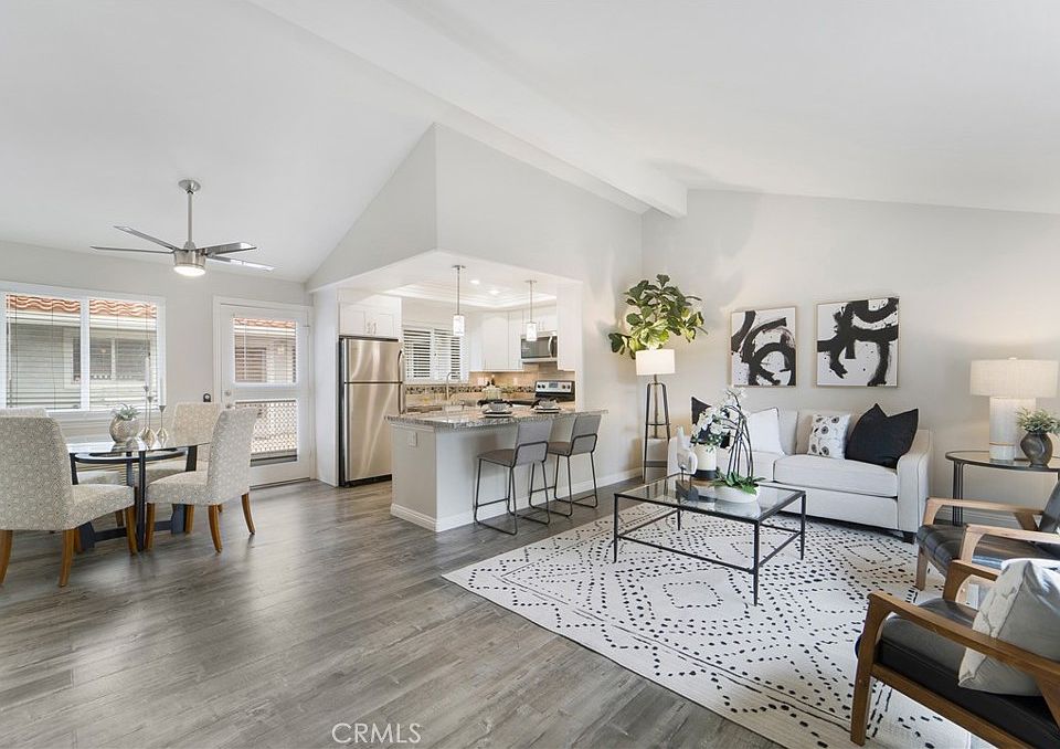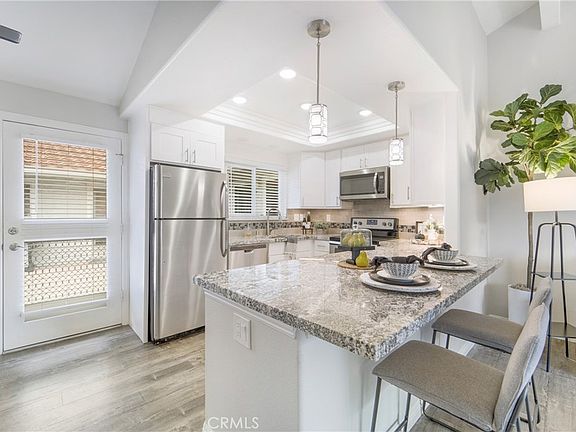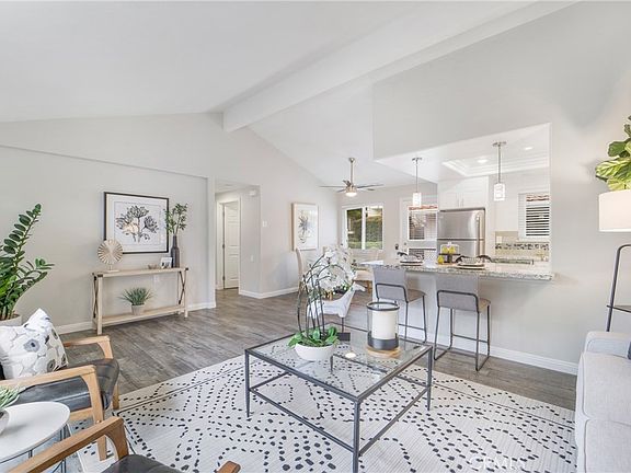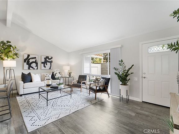 55+ community, live your best life in this gorgeously updated 2 bedroom condo! This home checks all the essential boxes. Starting with its ground level entry with no stairs or neighbors above or below. This San Sebastian model features an open floor plan with vaulted ceilings and many windows allowing for a ton of natural light. The kitchen boasts newer white cabinets, a large breakfast bar with granite counters & pendant lighting, stainless steel appliances and recessed lighting. Additional upgrades include laminate wood flooring, crown molding, base boards and recessed lighting through out, dual pane windows, newer ac wall unit, ceiling fans in dining room and bedrooms, INTERIOR LAUNDRY in hall closet, both bathrooms have been nicely upgraded and so much more to see. Laguna Woods community offers: guarded gates, 7 clubhouses, 5 pools, 2 golf courses, 10 tennis courts, 2 fitness centers, 2 green houses, horse stables, library, performing art center, 24-hr security, bus services, and much more.