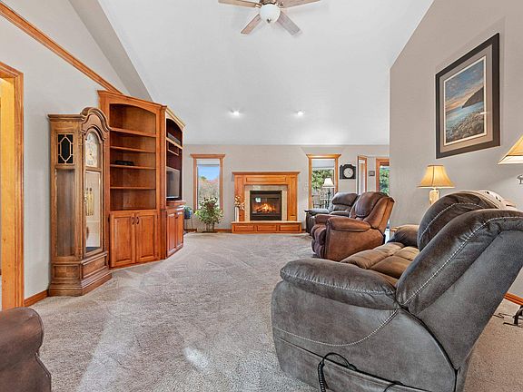 Three Musts! Location, Acreage, Ranch style beauty! Over 3400 sq ft exposed ranch: 4/5 bedrooms, 3.5 bath, 2 gas fireplaces, cathedral ceiling, split bedroom design, fully applianced kitchen-dining area, maple cabinetry, newer granite countertops, bump out dining with new Pella patio door, primary suite with tray ceiling, primary bath with whirlpool tub, separate shower. Office with French door, wood accent walls/crown molding. First floor laundry/half bath with washer and dryer. Finished lower level with daylight windows: family room, gas fireplace, 4th bedroom, exercise room, full bath & overflow room. GFA, new C/A 2023. Finished 3 stall garage, extra side slab. Newer Amish steel shed on slab, new Trek deck. Nature view/privacy, 2 apple trees on 1.42 acres! Landscaping is gorgeous!