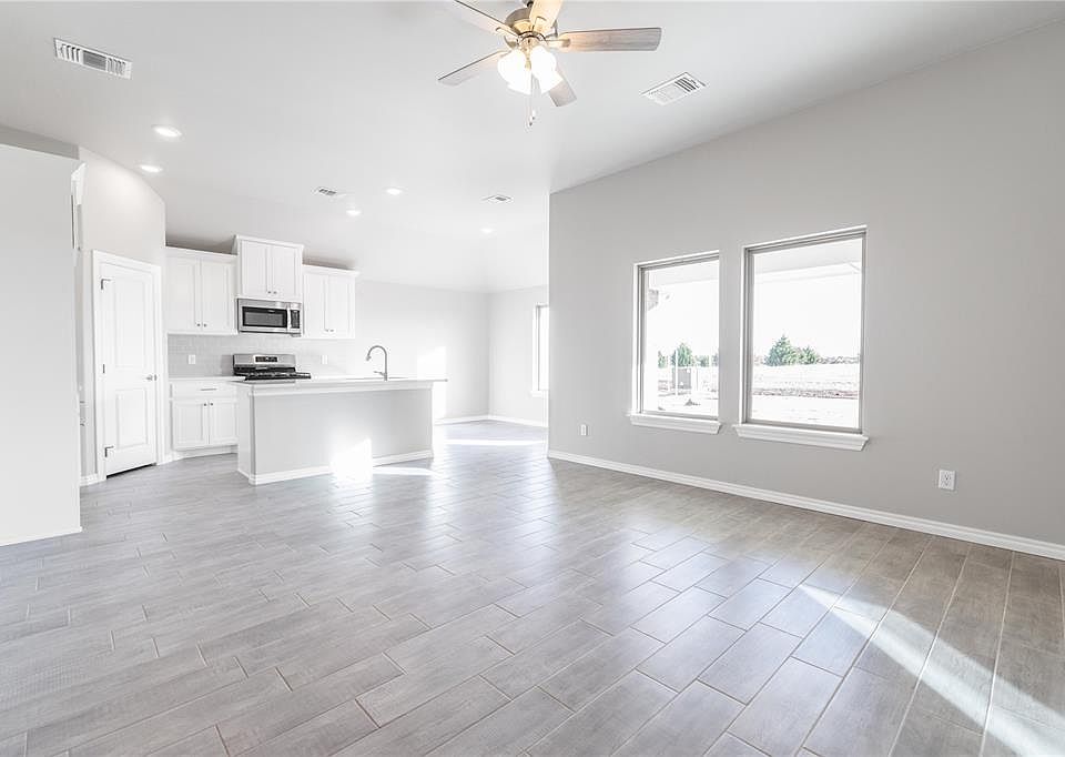 This Tero floor plan includes 1,680 Sq Ft of total living space, which includes 1,565 Sq Ft of indoor living space and 115 Sq Ft of outdoor living space. There's also a 385 Sq Ft, 2-car garage with a storm shelter installed. This affordable home offers 4 bedrooms, 2 full baths, covered patios, and a utility room. The great room welcomes large windows, wood-look tile, a ceiling fan, and Cat6 wiring. The charming kitchen has 3 CM countertops, stainless-steel appliances, wood-look tile, well-crafted cabinets with decorative hardware, a center island, and stylish tile backsplash. The primary suite is straight ahead and supports carpet flooring, a ceiling fan, and the perfect sized windows. The attached primary bath suits a dual sink vanity with an elegant countertop selection, an elongated water-saving toilet, a tub/shower combo, and a walk-in closet! The outdoor living section is covered and has fully sodded yards with smart home irrigation control. Other amenities include a tankless water heater, a fresh air intake system, and MORE!