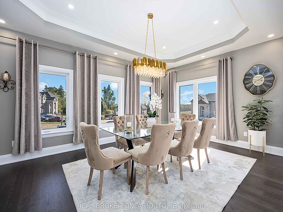 Welcome to 2236 Pemberton Way, an exceptional 5-bedroom, 4.5-bath luxury residence offering 4,373 sq ft of refined living space on a rare nearly 1-acre lot in the prestigious Churchill Downs Estate Community of Innisfil. Perfectly positioned on a quiet cul-de-sac with no sidewalk, this nearly new home showcases timeless elegance and modern sophistication. A 3-car tandem garage, plaster crown moldings, elegant wainscoting, and coffered ceilings set a grand tone, complemented by hardwood flooring, 8 ft doors, 7" baseboards, and designer trim detailing throughout. The heart of the home is a custom chefs kitchen featuring a striking quartz island, undermount cabinet lighting, furring panel with valance, and premium built-in appliances, including a 48" THOR gas range with 7 burners and grill, 48" chimney hood, 30" KitchenAid double oven, 42" built-in KitchenAid fridge, dishwasher, and a bespoke coffee pantry station. The living area exudes sophistication with a gas fireplace framed by a dramatic bookmatched porcelain slab and fluted accent panels, while expansive 8 ft sliding doors seamlessly connect to the sprawling backyard, offering endless potential for an outdoor oasis. Additional features include pot lights throughout, 24" x 24" porcelain tiles, zebra blinds, security cameras, central vacuum rough-in, air conditioning, and second-floor laundry. Just 1 year and 2 months old and covered under Tarion warranty, this residence combines architectural elegance, premium finishes, and modern functionality in one of Innisfils most sought-after communities.