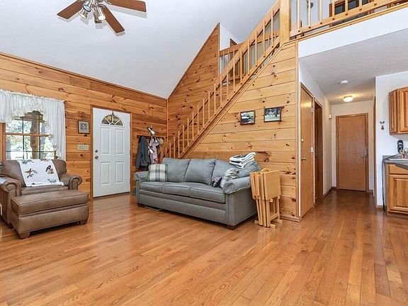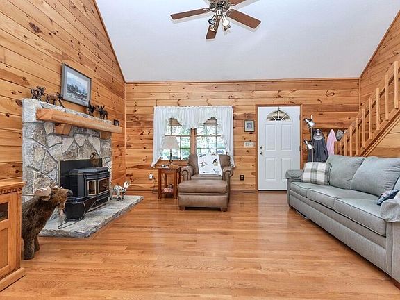 1st floor-A GR w/cozy frpl sets the scene for relaxation. A darling KT & DR includes appliances and a walk-in pantry/laundry. Owner's retreat w/full BA featuring a soaking tub & separate shower. 2nd floor has a loft that overlooks the GR, which could be used as an office, game room, or additional sleeping. A spacious BD to accommodate your guests or loved ones—a full BA to ensure convenience & privacy. Full LL w/tall ceilings could be finished for additional living. The large covered front porch and cedar siding add to its rustic appeal. Gutter guards offer low maintenance. A 16x15 deck for outdoor gatherings. It is wired for a hot tub. Explore the mowed path through the woods. At the back of the property is a captivating approx. 30' tall rock cliff.