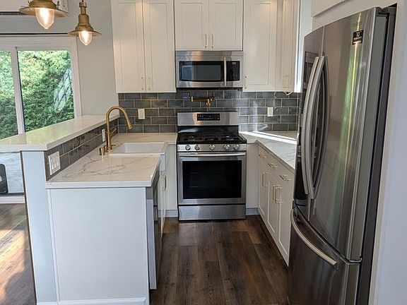 Full gourmet kitchen with peninsula, and all new stainless steel appliances (refrigerator, stove, microwave, & dishwasher).