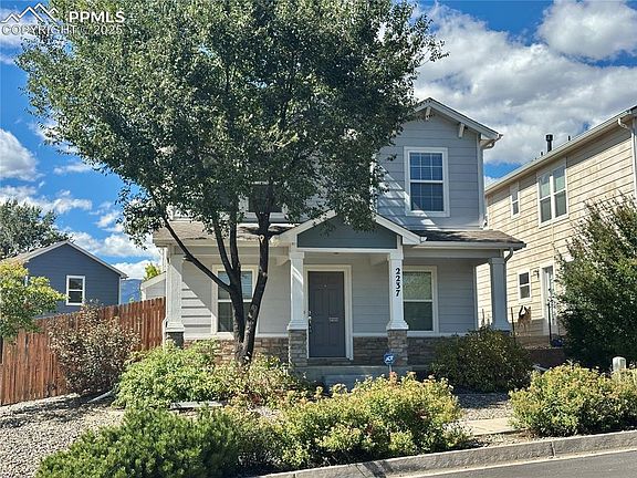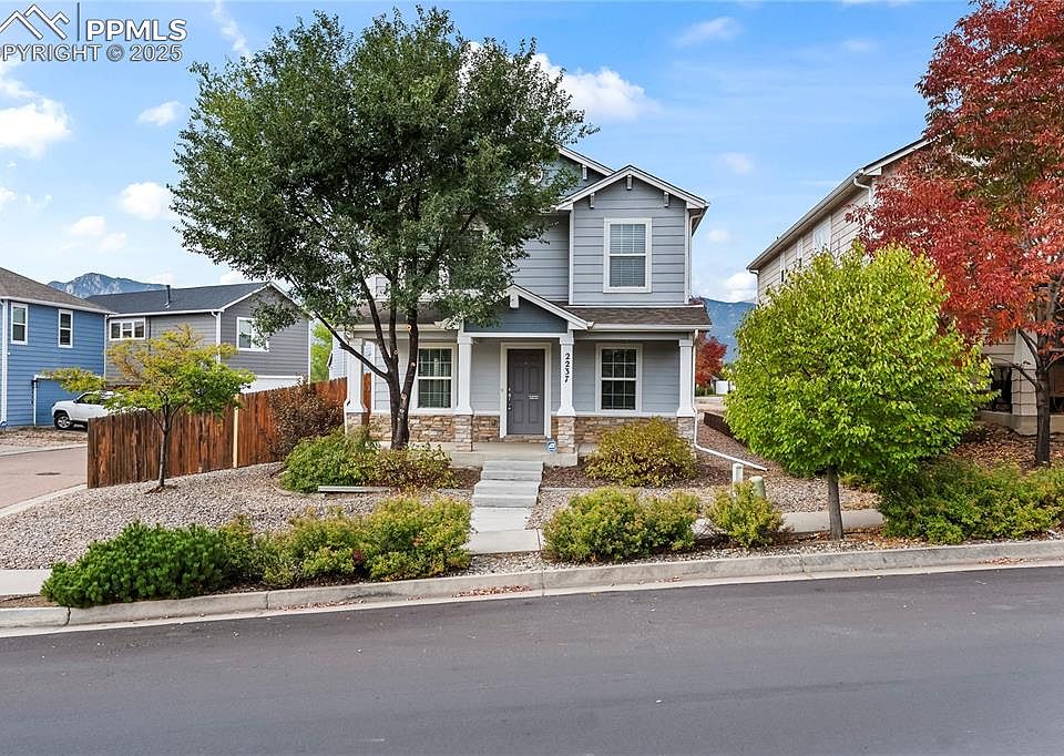 This could be your new home! Located on a corner lot across from a big, beautiful park, this three bedroom home in the Parkview at Spring Creek area is a great find! The big, beautiful porch with tall columns and brick accents is a perfect place to sit and people watch. Inside, you will find a bright, open floorplan. Off to the the right is a formal dining room or great office area. The spacious living room has a gas fireplace, half bath and connects to the large, open kitchen with breakfast bar. A walk-out to the private, fenced backyard is located next to the eat-in in kitchen. Upstairs you will find a very spacious loft area for a family or media room. The primary bedroom includes a private bath and large, walk-in closet and the mountain views are beautiful! Two more bedrooms and a large, full size bathroom finish out the upper level. The fenced yard has a large gate so a camper could be stored. Great location close to shopping, dining, schools, parks and entertainment and a quick commute to Fort Carson or Peterson AFB.