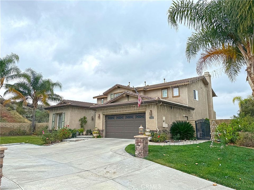 Spacious 5 bedroom Home on an extra large view lot over 23,000 sq. ft. with a view. One full bedroom and full bath down. Four more bedrooms upstairs. Kitchen has granite counters and large center island also with granite. Walk-In pantry and double ovens. Breakfast bar and dining nook. Formal living and dining rooms. Family room with cozy fireplace. Plantation Shutters, Ceiling Fans & Recessed Lights. Upper floor laundry room with extra storage. Very spacious primary suite with walk out balcony. Pool size lot and large covered patio area. Nicely situated at the end of the cul-de-sac with large driveway. 3 Car Garage. NO HOA. NO MELLO ROOS! This street is extra festive with tons of holiday decorations during the Christmas season.