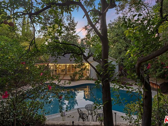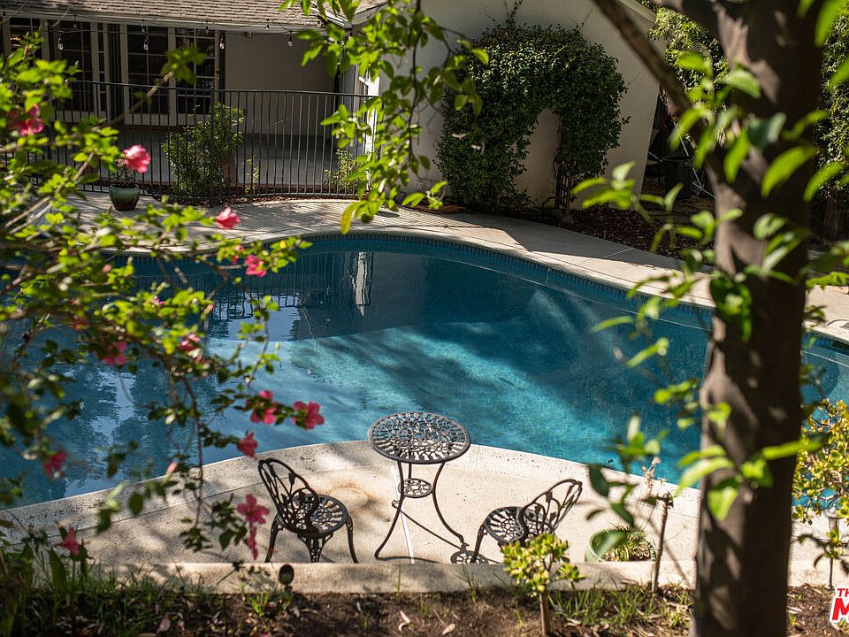 Sun-Drenched Mid-Century Gem South of the Boulevard. Set on a generous 11,000+ sq ft lot, this property is your private retreat. Tucked away on a serene Woodland Hills street, this timeless mid-century home blends original charm with thoughtful updates. Sunlight pours through oversized windows, highlighting warm wood details, original built-ins, and the cheerful vintage kitchen with its sunny yellow tile. Sliding glass doors from both the living room and primary suite open directly to the outdoors, creating an easy flow between indoor comfort and outdoor tranquility. Outside, the backyard unfolds as a true oasis; serene, lush, and home to one of the largest pools in the neighborhood. Just above, a rare flat pad of land offers endless potential: envision a garden, play space, or creative project uniquely yours. Inside, the airy layout offers generous living and entertaining spaces, complemented by tasteful updates including enhanced electrical, a new oven, fridge, and foundational improvements for added peace of mind. Perfectly situated south of the Boulevard, in a coveted location close to Ventura's dining, shopping, and cafes while still tucked away in the quiet calm of the canyon.