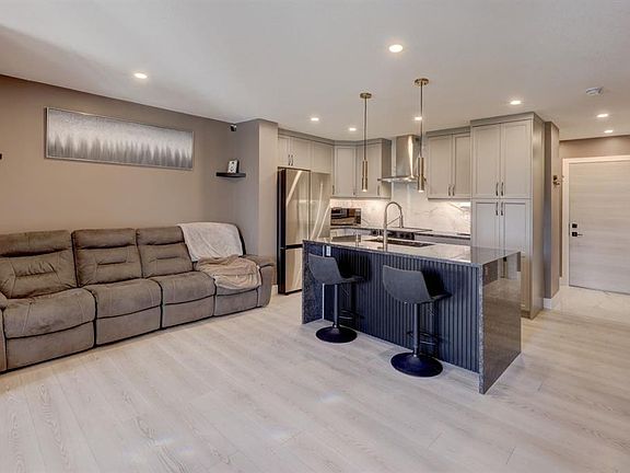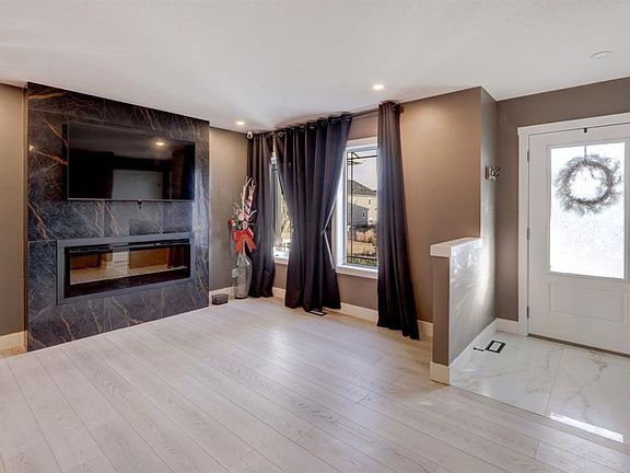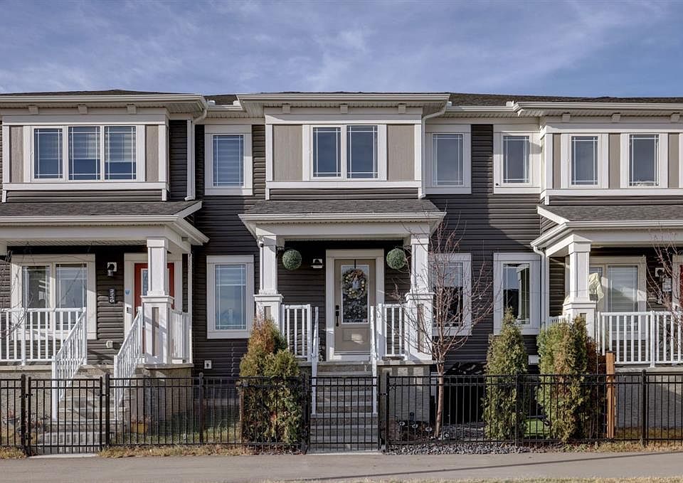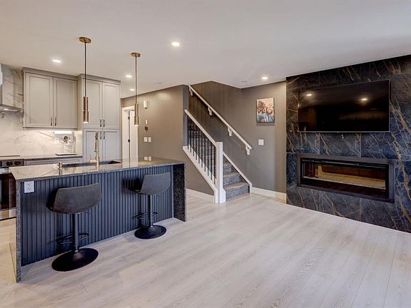 Welcome home to this show-stopping townhome in SW Airdrie, perfectly designed for modern living — with no condo fees! Enjoy mountain views from your private patio and every thoughtful upgrade throughout. The main floor features an open concept layout with a chef-inspired kitchen, granite waterfall island, full-height cabinets with valance lighting, and stainless steel appliances. The living area showcases porcelain tile fireplaces and designer finishes that set this home apart. Upstairs, the spacious primary suite offers a walk-in closet, luxurious ensuite with a floating vanity and motion-sensor lighting, plus a private balcony to take in the mountain views. Two additional bedrooms, upper laundry, and a full bath complete the level. Downstairs you’ll find a beautifully finished basement with a wet bar and brand-new mini fridge, perfect for entertaining. Other highlights include sound and safe party-wall insulation, R80 insulation value, 48 pot lights, 48"x24" tile in baths and mudroom, TV walls in all bedrooms and living spaces, exterior garage plugs, and a second hose bib. Double garage, landscaped yard, and a location steps from parks and new schools make this home the full package. Move-in ready and truly upgraded to the max!