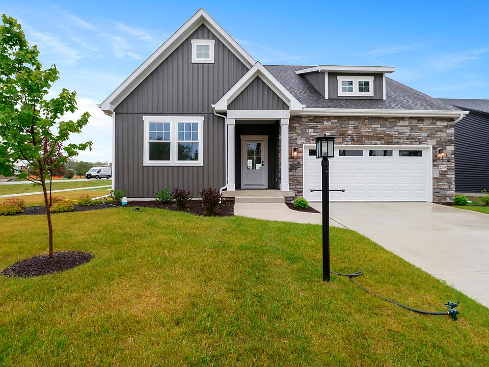 Don't miss this new construction completely move-in ready home! Set on a 0.39-acre corner lot, this open-concept ranch features 3 bedrooms, 2 full baths, and a modern, functional layout. The kitchen is outfitted with quartz countertops, stainless steel appliances (refrigerator, gas range, dishwasher, microwave), and a large island with seating potential. A sliding glass door off the living room opens to a concrete patio--perfect for outdoor dining or relaxing. The owner's suite offers a double bowl vanity, glass-door shower, and a spacious 5x8' walk-in closet. The secondary bath is intelligently designed with a separate room for the toilet and shower, plus another double vanity for added convenience. Durable laminate plank floors extend through the kitchen, living, dining, and entry areas. The living room includes custom built-in bookcases, and the mudroom/laundry combo offers a drop zone with additional built-ins for storage. Enjoy 9' ceilings on the main floor and in the unfinished basement. The basement is easy to expand for added living space with an egress window and roughed-in plumbing. Additionally, the two car garage is fully insulated and finished. Nestled in a quiet neighborhood just steps from the Iron Horse Heritage Trail, this home offers a peaceful, nature-filled setting while still being minutes from shopping, restaurants, schools, and expressway access. With quick connections to I-94 and the 80/90 Toll Road, it's a fantastic location for commuters.