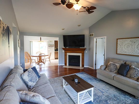 Step inside to find hardwood floors flowing through the main living areas, with plush carpet and a private bathroom in the primary bedroom. The open-concept living room features vaulted ceilings and a ceiling fan, creating a bright and airy feel that connects seamlessly to the dining space and kitchen.