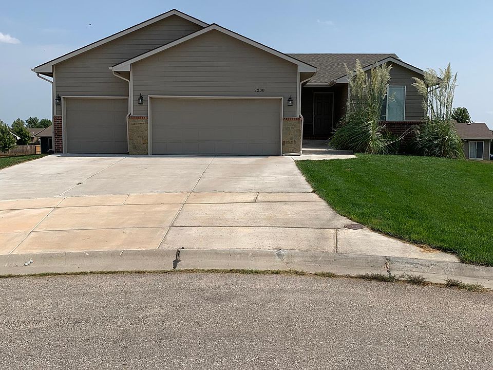 Super Sweet newer 5 bedroom, 3 full bath home, 3 car garage in great Westside Neighborhood. Goddard Schools. All wood flooring except for bedrooms. Main floor boasts Master Suite with private bath, granite, double vanities and 3rd spot for make up vanity etc. Huge walk in master closet with main floor laundry. 2 additional bedrooms with 2nd full bathroom on main floor. Kitchen comes equipped with all appliances including microwave. Can supply refrigerator is someone needs it. Huge backyard and walk out patio from basement. Basement is large and has a great built in wet-bar with room for refrigerator if desired. 2 large additional bedrooms downstairs with 3rd full bath. This a a beautiful home located in the Turkey Creek Addition off of Pawnee and between 119th and 135ht St. West. Close to Airport and Goddard. (Goddard School District) Great neighbors! Super find! Please call for more information! - Thank you! Min. of 1 year lease - $30.00 non refundable app fee per person over 18 No Cats 1 small dog under 20 lbs. might be considered with non-refundable pet fee. Only 1 and No cats. (no aggressive breeds) Tenant(s) responsible for all utilities and lawncare/snow removal We do back ground checks No evictions No felonies No Section 8 Income must be 3 x the amount of rent Thank you! Non smoking property