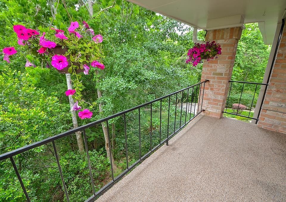 Private balconyLight-filled residenceIn-unit laundrySerene bayou viewsElegant wood-style flooringLush landscapingKitchen features granite countertops