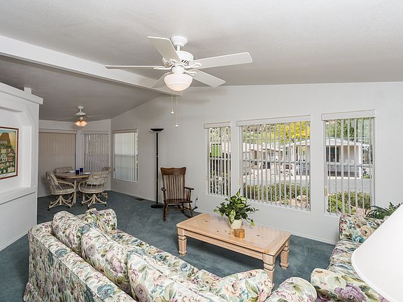 You will love this bright and cheery home with lots of windows and natural light! With a beautiful park-like setting... This home enjoys 2 bedrooms/2 bathrooms, living and dining room combo + a separate den area or family room. The kitchen has a small eat-in area. The exterior of the home was painted spring 2019, and much of the interior was painted then also. Added bonus: in 2015, Pex Plumbing was added. This is a very gently lived in home, enjoys city utilities and a lovely covered deck. This is a 55+ age community. Sweet property!