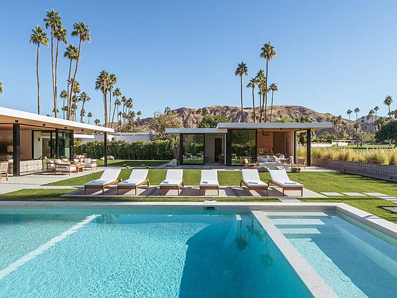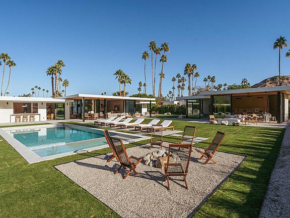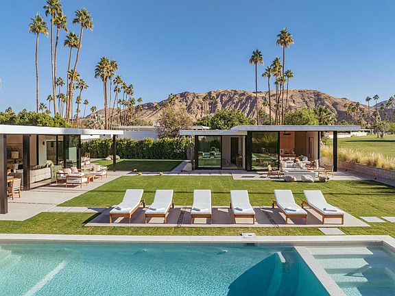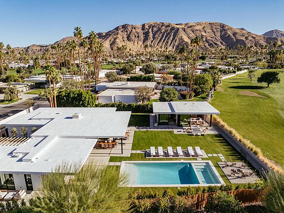 THE trophy property of the 2024/2025 season. Almost entirely new construction, with breathtaking southern and western views. Located within Indian Canyons, one of the most sough-after neighborhoods of Palm Springs. This spectacular re-creation of a midcentury golf course estate was originally built in 1963 by developer Boris Gertzen and architect Ken Burgess. Gertzen, who also developed much of the neighborhood, hand-selected this lot for his own daughter by virtue of its location, larger size, elevation and views. In 2024 LA based HOLDING 44 Development completed a full re-design and re-imagination of this stunning property. Today, sitting proudly on an elevated lot, this 5 bedroom 7 bath compound features a long list of upgrades, including 10' moveable glass walls, tongue and groove ceilings, pocketing glass which connects indoor and outdoor dining, high-end appliances, networked Lutron lighting system, a new-construction detached guest house with kitchenette and its own laundry, brand new oversized resort-style pool with tanning shelf and 10-person spa. A complete list of upgrades is available upon request. Custom furniture is available for separate purchase. Truly like nothing else on the market. Call today for private showings.