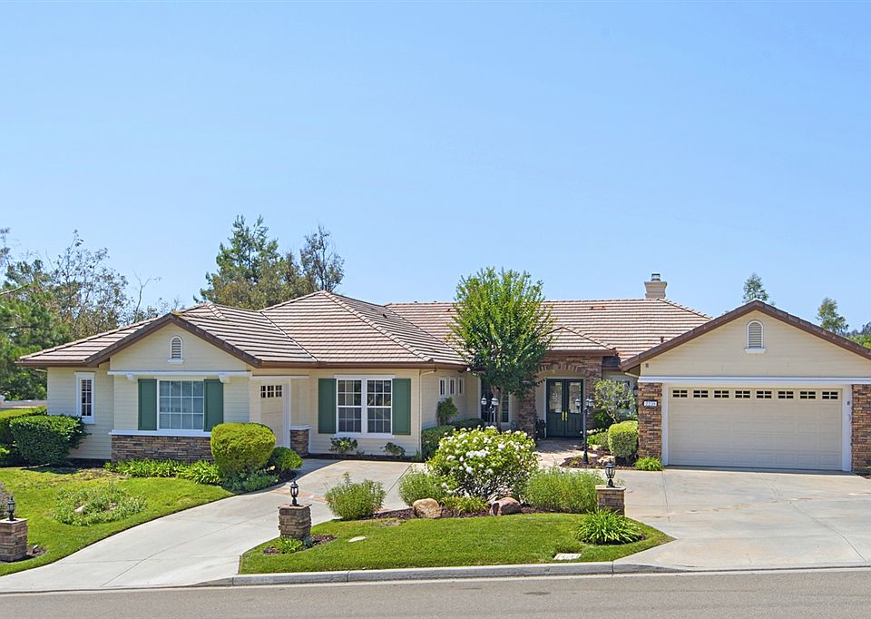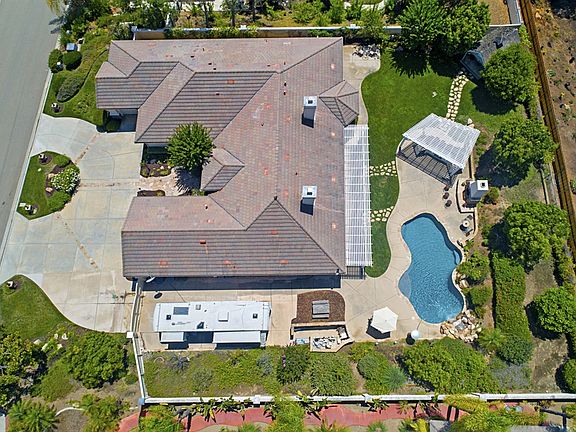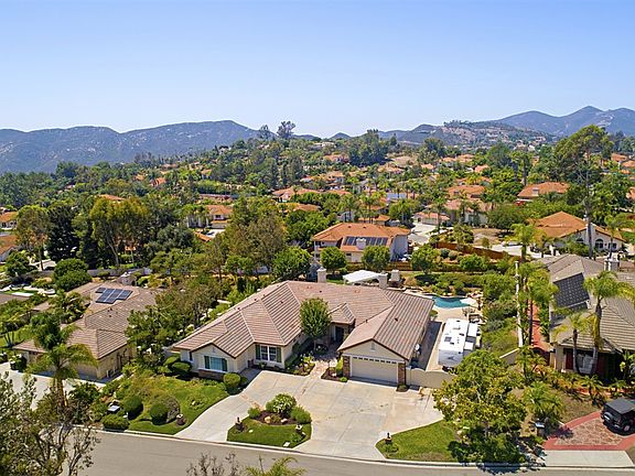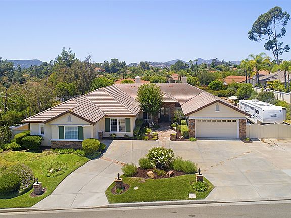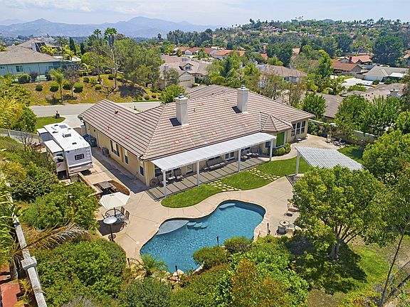 Cascading rock waterfalls flow into the flagstone rim pool in this resort-style setting w/outdoor kitchen seating 8 & fireplace, lush green lawn & a play/pool house! Wide gated RV parking w/hookups! Light open interior w/large rm sizes! All BRs en suite. Office/possible 5th BR. Luxury-size master suite w/sitting rm! French doors open from the formal living & dining rm to the beautiful back yard! Gourmet kitchen w/center island & granite counters opens to Fam Rm w/surround sound. Crown moulding thruout! Located in coveted Rancho Verde Estates near Lake Hodges, this single level home offers a premium quiet private setting on .45 acre with a beautiful resort-style back yard! Gather around the outdoor fireplace or relax by the flagstone rimmed pool w/cascading waterfall. The outdoor kitchen & pergola seats eight & features a granite counter top, BBQ, two gas burners, refrigerator & sink. There's plenty of lawn play area too! The kids will love the play house complete with play room, loft, sink, electricity & toilet! The interior of this home is light & open w/tall ceilings & crown moulding thruout. The gourmet kitchen features a center island w/seating for 4 & pendant lighting above, granite counters, crown moulding, GE Monogram 6 burner gas cooktop with grill, GE Monogram double ovens µwave, built-in GE Monogram refrigerator & informal dining area. It opens to the family rm with ledgestone fireplace, built-in media center, cabinetry & shelving & surround sound speakers. The master retreat has two rooms - a sitting room w/bay windows looking out to the back yard & the master bedroom w/trey ceiling & crown moulding & adjacent bath w/walk-in closet w/organizers. Exclusions: Entry pendulum light, garage shelving & plastic shed at side of house.