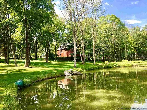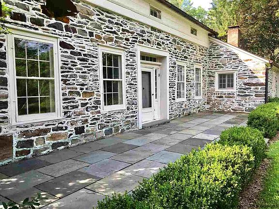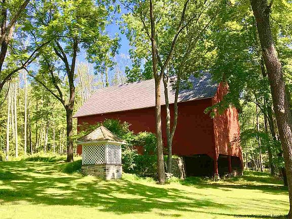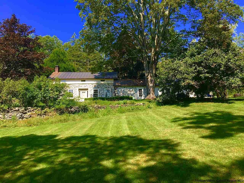 Historic Stone Estate located on one of the most desired and sought after roads in the charming Town of Stone Ridge. This fine historic home with graciously proportioned high ceilinged rooms and filled with period detail is the essence of elegant simplicity. Beautiful six over six windows allow for gorgeous views and bright sun filled interior. The Living Room with built in library case, fireplace and window seats is the perfect place to gather before entering the large dining room perfect for holiday gatherings. Large eat in kitchen with "bee hive" oven fireplace with woodstove lends itself to cozy fireside meals. Expansive den with French doors leads to bluestone patios overlooking graceful park like grounds. The 13.5 acres, with land on both sides of the road, includes established gardens, mature plantings, sweeping lawns, fruit and nut orchard, outbuildings and gives the feeling of a gentlemen's farm. To complete this picturesque setting is a truly beautiful, significant and historic red barn, tree house and huge pond. A modern touch is added with solar panels. Separate cottage is perfect for the writer or artist. This stately property, which will include most furnishings, is in such an excellent location that it is not to be missed.