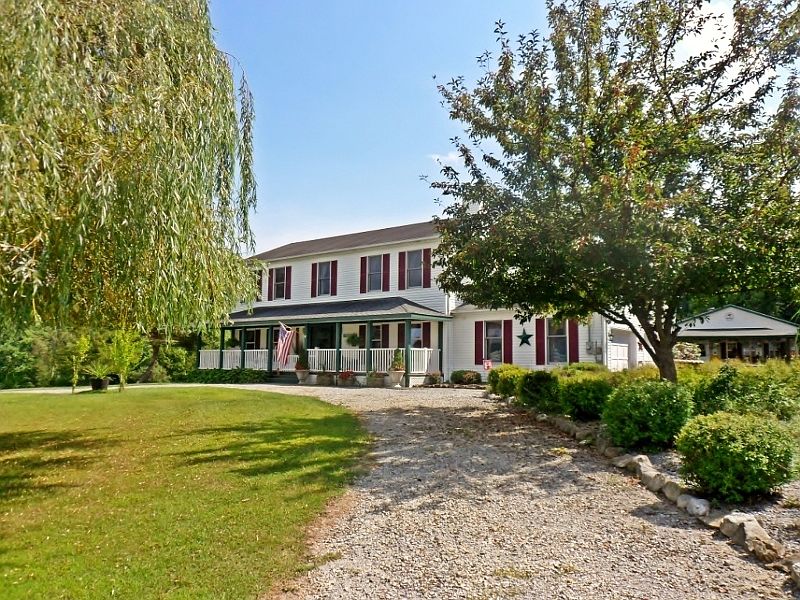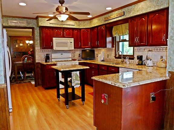 Updated immaculate home w/separate 3 plus car garage equipped w/heat, extra storage, spacious parking. Bring your cars, trucks, equipment & work from home. 2 extra out buildings & incredible property that backs up to parkland. Baths have cherry vanities. Kitchen boasts cherry cabinets, tile back splash, granite and sliders that go out to paver patio 1/2 covered for rainy days. Waterfall, plus fenced area enhance the hot tub & cute covered porch that welcomes you to the detached garage. A circular drive invites you to the Trex covered front porch & lovely landscaping. This is a special property that must be seen.