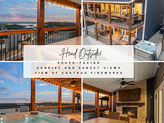 Opulence & Opportunity. This exceptional 9-bedroom, 8.5-bathroom property offers the ultimate blend of luxury, comfort, and income potential. Sold fully stocked and turn-key, everything you see stays with the home--making it a seamless active nightly rental or private getaway. Styled with warm, inviting Pottery Barn-inspired decor and high-end finishes throughout, every bedroom includes its own en-suite bathroom for a truly elevated guest experience. The spacious bunk rooms (yes, there are two) accommodates up to 8 guests and the entire home accommodates up to 22-24, ideal for larger groups. There is also a sleeper sofa on the main level. Enjoy breathtaking 180-degree views of the Ozark Mountains and Table Rock Lake from the expansive, southern-facing outdoor living area, complete with a private hot tub, outdoor fireplace, and multiple sitting areas--perfect for relaxing evenings or catching the fireworks show at Chateau on the Lake. The lower-level rec area is a crowd favorite, featuring a huge sectional, stocked kitchenette, pool table, arcade games, and more. Custom masonry work using real stone (the only home with this in the community), crafted with care by the meticulous seller, adds timeless charm and quality throughout.The location is truly unbeatable--just minutes from Silver Dollar City, State Park Marina, Shepherd of the Hills Fish Hatchery, The Strip, Branson Landing, Ledgestone Golf Course, and all the attractions and amenities of Big Cedar Lodge and Top of the Rock. Community features include an indoor and outdoor pool, basketball and tennis courts, and a playground, offering fun for all ages. Whether you're looking for a savvy investment or a spacious personal retreat, this home delivers on every level.