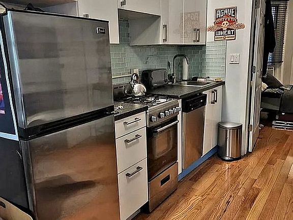 Open kitchen style. Full sized stainless steel appliances and a dishwasher.