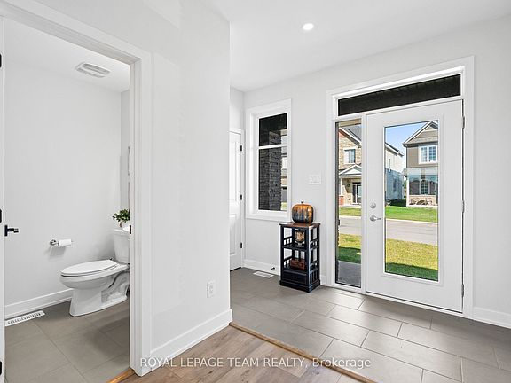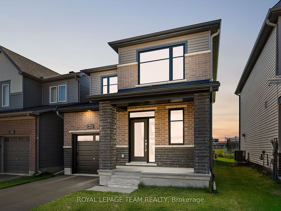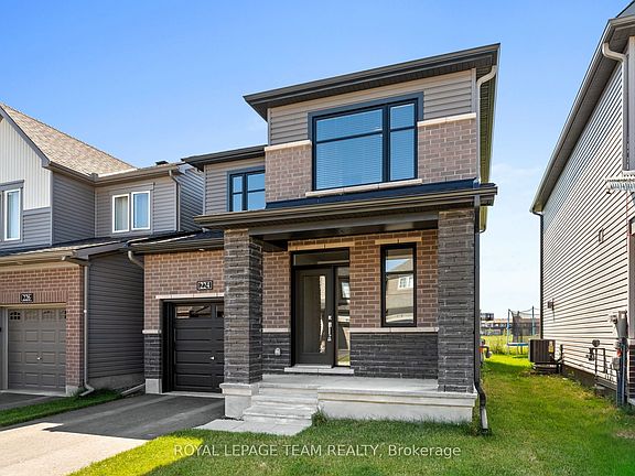 Situated in a family-oriented area of Kanata, this 2024-built Minto Hyde model offers convenient access to retail, restaurants, schools, parks, recreation, and the Kanata High Tech Park. This detached home blends contemporary design with a functional layout, tailored for comfortable family living. The exterior features black-framed windows, a welcoming porch, and a full-lite glass front door that adds a modern edge. Inside, the floor plan is designed with family life in mind, offering three bedrooms and three bathrooms, along with a bright, open-concept layout. The main level showcases 9-foot ceilings and a neutral colour palette that enhances the sense of space and light. The dining room opens to the living room that is highlighted by a modern rectangular natural gas fireplace, recessed niches, and windows that overlook the backyard with no direct rear neighbours. The kitchen is appointed with flat-panel cabinetry, elongated subway tile backsplash, stainless steel appliances, quartz countertops, and a centre island with an undermount sink and a waterfall edge on one side. Upstairs, the primary bedroom benefits from a walk-in closet and an ensuite featuring an upgraded glass shower and a vanity with dual sinks. Two additional bedrooms, a four-piece bathroom, and a dedicated laundry room complete the second level. Additional features include a single attached garage with interior access.