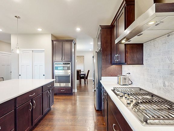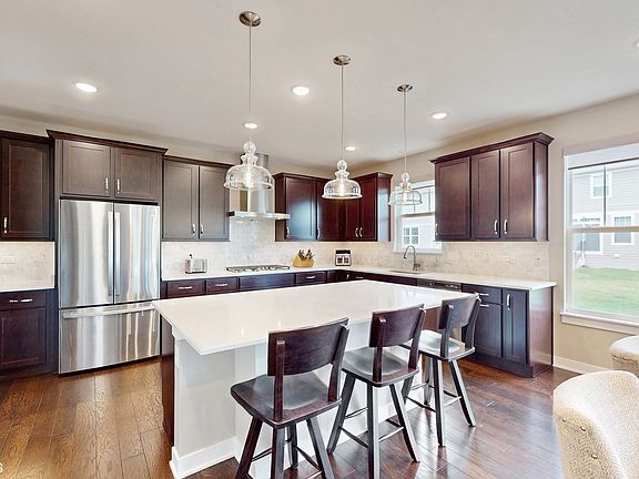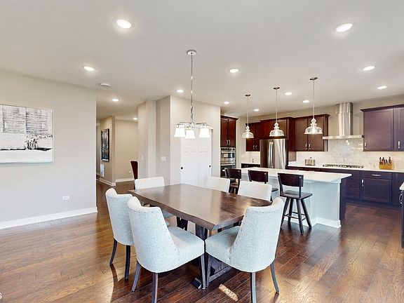 Rare opportunity in Link Crossing! This well-maintained, nearly-new home offers a versatile layout designed to accommodate a variety of needs. The welcoming covered porch leads into a main level with wood flooring throughout. The kitchen features 42" espresso cabinetry, white quartz countertops, subway tile backsplash, and stainless steel appliances-including a French door refrigerator, built-in oven, microwave, gas cooktop, and dishwasher. A spacious eating area flows into the family room with a fireplace and surround sound speakers. The formal dining room offers additional space for gatherings. A main floor den, located away from the primary living areas, includes a closet and is adjacent to a full bath-ideal for a home office or guest space. Additional main level features include a walk-in closet and a drop zone at the garage entry. Upstairs, the trayed primary suite includes two walk-in closets with organizers and a private bath with dual vanities, a large shower with dual shower heads, and a separate commode area. Bedrooms 2 and 3 were expanded during construction and share a full bath with double sinks. Bedroom 4 has its own private bath. The second-floor laundry room adds everyday convenience. The full basement provides potential for future living space. Wi-fi tech upgrades, alarm system and video doorbell. Monthly HOA of 213.50 includes lawn care and snow removal. Located just two doors from the neighborhood park and a short drive to the local Metra station, schools, shopping, restaurants, charming downtown Long Grove and easy tollway access.