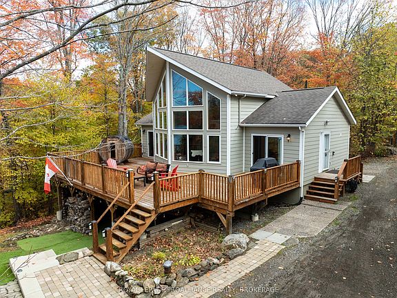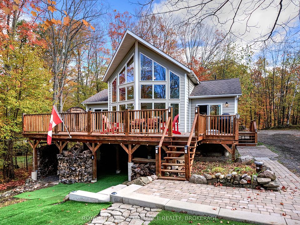 Beautiful and stunning 2 bedroom Viceroy home located on one of the most desirable lakes in our region. This home is located in Bayside Woods Cooperative, a lakeside property that has just under 5 acres of common land and 1100 feet of beautiful southwest facing shoreline. This home sits on an ICF poured concrete foundation and has access to the side yard through a double door that also allows for storage of yard equipment and perhaps some water toys. There is a finished recreation room with an electric fireplace, workshop and utility area. The main level of this home has an eat-in style kitchen, a laundry room, an inviting living room with cathedral ceilings, wood burning fireplace and floor to ceiling windows looking out over the lake. There are two bedrooms, 3pc. ensuite bathroom, another full 4pc. bathroom and stairs to the loft area. This area is currently set up as a sleeping area for extra family but could also be an amazing home office. The large cedar deck overlooks the land that has a slight slope down to the clear, inviting waters of Bobs Lake with a beach area that gradually gets into deeper water. There is a large storage shed and plenty of space for outdoor activities. The house is serviced by a septic system and drilled well and has fibre optic internet. The coop offers a convenient boat ramp and a storage building as well as a common dock. There are 14 owners of this cooperative property, who all take pride in their homes/cottages and the land that surrounds them. Bobs Lake is one of the largest lakes in our area stretching 19 kms long with many islands, bays and inlets to explore, fish and enjoy. Discover what this hidden gem has to offer and dive into cottage life on this stunning Canadian Shield setting. Annual fees (approx. $3522 for 2024) include common area hydro, docks, all maintenance and taxes. Hydro and road fees are in addition to these fees.