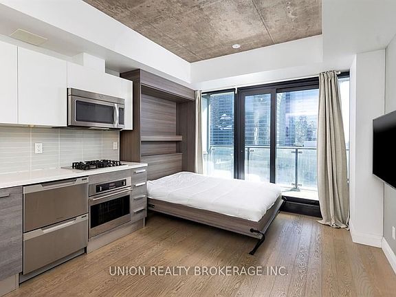 This fantastic, bright south-facing suite offers unobstructed views of the downtown skyline and Roy Thompson Hall, filling the space with natural light throughout the day. Designed with floor-to-ceiling windows, exposed concrete ceilings, wide-plank hardwood floors, and an open-concept layout. The modern European kitchen features integrated appliances and a gas cooktop. Upgrades include custom California Closets and a built-in Murphy bed. Step out onto the oversized balcony with a gas BBQ hookup and enjoy vibrant city views from the comfort of home. Residents of Theatre Park enjoy first-class amenities, including a rooftop pool with panoramic views, a fully equipped fitness centre, sauna, and 24-hour concierge. Steps from the Financial and Theatre Districts, King West dining and nightlife, the PATH, and the subway, this is urban living at its finest!