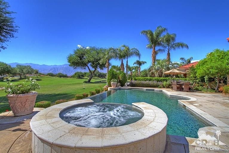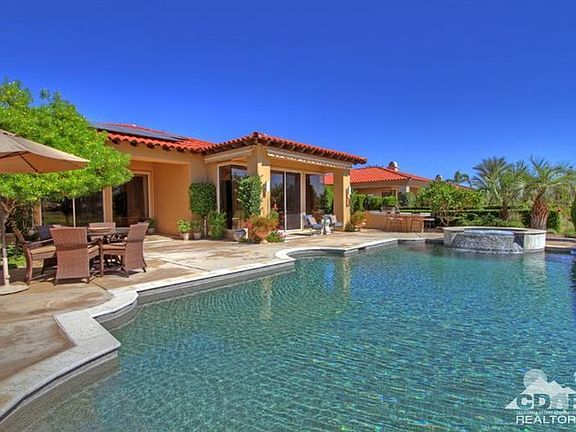Highly Upgraded and Customized in Coveted Legacy at Mission Hills with Spectacular Southwest View. Enter through custom gates to a courtyard and double glass door entry. A dramatic and elegant Great Room features travertine floors, crown molding, fireplace, sunken bar and formal dining. An open Family Room and Gourmet Chef's Kitchen are great for casual desert living. Kitchen with granite countertops, stainless appliances, island and walk-in pantry. Family Room has custom built-in entertainment center and wall of glass with Views. Custom Library Wall provides character. Master Bedroom Suite with access to Pool Terrace, Spa-like Master Bath with Marble Finishes and Custom Closet. 2 Guestrooms with Ensuite Baths and a large Casita with fireplace and refreshment center. Outside are a Built-in BBQ Island, Covered Living Areas, Infinity Pool and Spa all with stunning South and West Mountain and Fairway Views. Solar Equipped and Move-in Ready for your Season in the Sun!