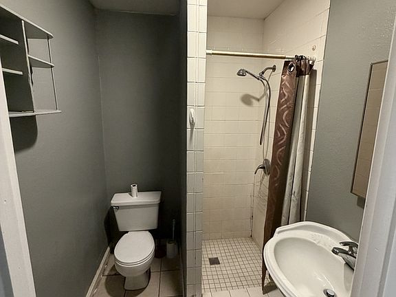 Bathroom includes a walk-in tiled shower, pedestal sink, and standard toilet. Individual front entrance in a shared building corridor. Shared parking lot with available tenant parking