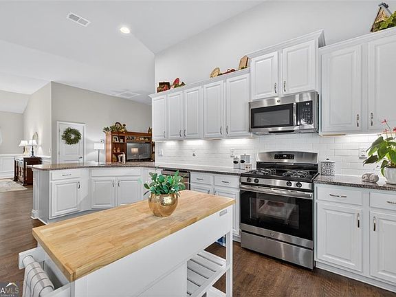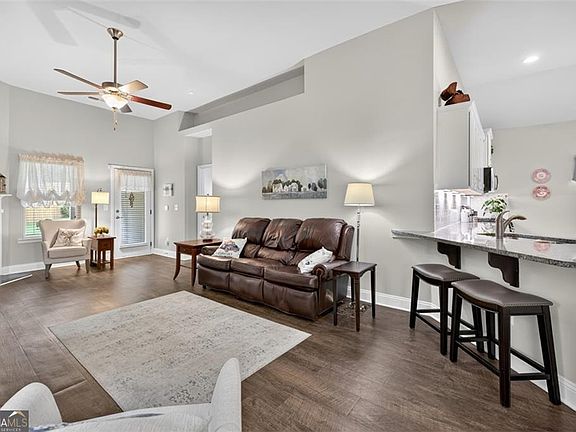 Welcome to your dream home in the highly sought-after 55+ Active Adult Community of Commerce, GA! Step inside this stunning 4-bedroom, 2-bath ranch home where charm and modern design meet. A classic rocking chair front porch greets you before entering into a bright, open-concept layout with soaring 10 ft ceilings, creating an inviting space perfect for both everyday living and entertaining. The gourmet kitchen is a chef's delight, featuring granite countertops, crisp white cabinetry, stainless steel appliances, and ample cabinet and counter space. The kitchen flows seamlessly into the spacious living and dining areas, with new LVP flooring throughout, a gas fireplace as the centerpiece, and abundant natural light. The dining room, accented with beautiful trim work, is large enough to seat over 10 guests, making holiday gatherings a breeze. Retreat to the primary suite, a true oasis with tray ceilings, serene backyard views, and plenty of natural light. The luxurious primary bath includes dual granite vanities, a beautifully tiled glass shower with rain shower and body sprayers, and elegant finishes. Secondary bedrooms are generously sized, each with great closet space and natural light, accompanied by a stylish full hall bath for convenience. Step outside to your screened porch overlooking a beautifully landscaped private backyard, the perfect setting for morning coffee or evening relaxation. Additional highlights include a garage with workshop space and an extra parking pad for guests. This home offers the perfect blend of comfort, style, and convenience in an active adult community!