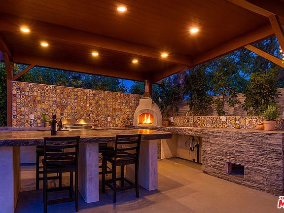 Waterfall wallStatement fireplaceSecond full kitchenSerene backyard retreatExpansive kitchenHollywood regency chandelierCustom cabinetry