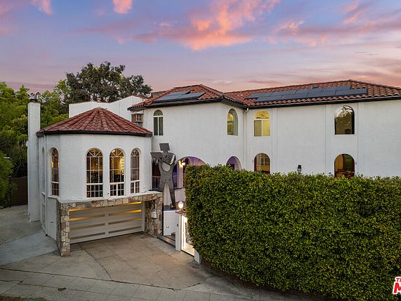 Introducing The Transformer House a bold intersection of architecture, artistry, and endless potential. Built in 1924 and set behind mature hedging on a nearly 10,000 sqft corner lot in the Los Feliz Hills, this Spanish Mediterranean home is both a private sanctuary and a living gallery. Known for its life-size Transformer sculptures, striking installations, and commanding street presence, the home now offers an opportunity to evolve whether preserved, reimagined, or transformed into something entirely new. Beyond sculptural gates and a tranquil water feature, a custom wood-and-metal framed door opens to a dramatic formal entry. Inside, the living room boasts high ceilings, arched windows, and a statement fireplace. The expansive kitchen and dining area features custom cabinetry, leathered granite countertops, a Wolf 6-burner range, Sub-Zero refrigeration, and a walk-in pantry a true chef's kitchen built for both hosting and functionality. A powder room wrapped in custom Keith Haring wallpaper leads to a full bar with speakeasy-style storage, connecting to a flexible recreation room with a pool table, poker table, craps table and a cozy study/ library nook. French doors open to a serene backyard retreat with a spa, pizza oven, full bar, fire pit, and a dramatic waterfall wall anchoring the atmosphere in calm sophistication. The lower level offers exceptional versatility with a private 2-bedroom, 2-bath unit complete with its own kitchen, garage access, and a separate entrance perfect for extended family, guests, or potential rental income. A two-car garage, additional outdoor parking, and generous storage complete the space. Upstairs, the original 1920s staircase, illuminated by a Hollywood Regency chandelier, leads to three bedrooms and three modern baths, each finished in porcelain and quartz with steam showers. Generous closets and a second full kitchen offer layout flexibility for multigenerational living, hosting, or creative adaptation. Whether you're an investor looking for a unique asset in a sought-after neighborhood, or a homeowner with the vision to refine a residence into a one-of-a-kind masterpiece, The Transformer House is a trophy property unlike anything else in Los Feliz. More than a home it's an invitation to create, evolve, and transform.