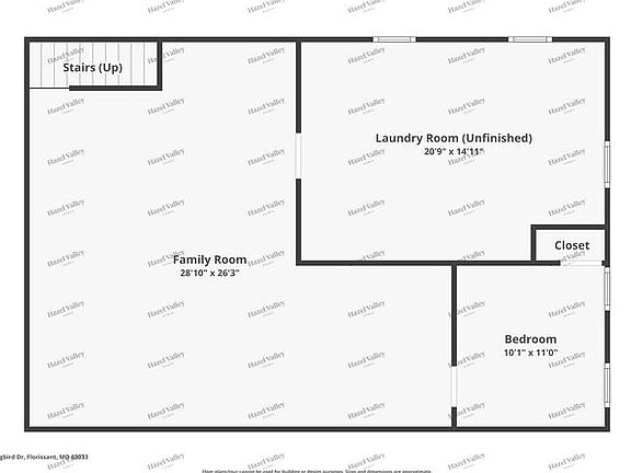 This single-story home in Florissant, Missouri offers approximately 988 square feet with 3 bedrooms and 1 bathroom. The exterior features red brick, white siding, a gable roof, and a concrete driveway leading to a covered carport. Interior flooring is wood-patterned throughout, with decorative wall paneling in select areas. The kitchen includes white cabinetry, granite countertops, a tiled backsplash, and stainless steel appliances: electric range, range hood, refrigerator, and dishwasher. The kitchen floor is ceramic tile.