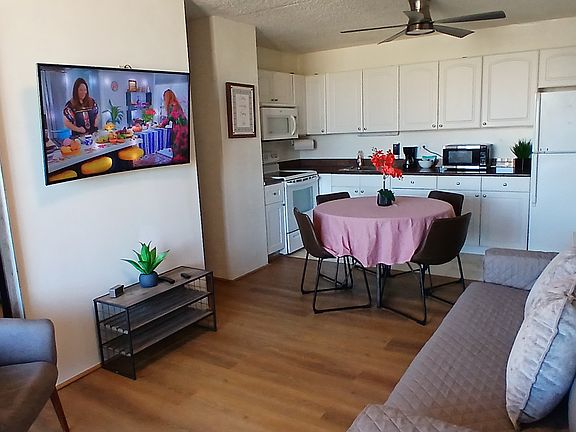 Furnished Apartment with 1 assigned, parking stall, a FULL KITCHEN with Electric & WIFI included. Apartment has a new queen bed & desk in the bedroom, new sofa & dining table in the living-room & great views from the balcony. Secured building full of amenities.....pool, BBQ area, gym, pool table game room & more! Close to the Beach, Shopping, Dining! There is a swimming pool but the ocean is only 5 minute walk to a Waikiki Beach to enjoy the surf, sun & sandy beach. Laundry room is on site also. Call for availability. Taxes and cleaning fee are not included in price.