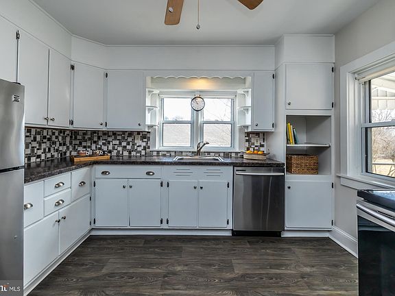 This sweet blue Cape Cod radiates comfort and all the cozy feels! Nestled above a flat, private yard at the end of a quiet street, this home offers a serene retreat with modern conveniences. It’s bright and breezy, with a large eat-in kitchen offering crisp white cabinets, stainless appliances, a stylish backsplash, and built-ins. The kitchen opens to a covered patio overlooking the picturesque back yard, perfect for relaxing with friends. Warm hardwood floors flow through the main level living room and bedrooms, one of which is spacious enough to be a luxe primary suite with a sitting/dressing room. Next to this large bedroom, a super clean and upgraded full bathroom features beadboard detailing, beautiful tile from tub to ceiling, and a new vanity. A second bedroom is tucked at the front of the house. The combo living/dining room is the heart of this home, exuding an airy cottage vibe and an abundance of natural light. Upstairs is an open finished room offering flexibility for a third bedroom, studio, playroom or office. What’s more, a pristine, walkout basement offers a tidy laundry room with double utility sink, plus ample space for storage and weekend tinkering. There is also a newer, detached one car garage and additional sheds for extra storage. Conveniently located near Route 30 and the Thorndale train station, you’ll enjoy easy access to transportation, shopping, and restaurants. Don’t miss the chance to make this welcoming home your own. Schedule your appointment today!