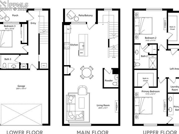 The Nolan is a thoughtfully designed three-story townhome that blends comfort, style, and convenience. On the lower level, you’ll find a spacious two-car garage, a welcoming entryway, and a private third bedroom with a full bath—perfect for guests, a home office, or a quiet retreat. The main floor showcases an open-concept layout ideal for entertaining, featuring a modern kitchen with a large island, Samsung stainless-steel appliances, and ample cabinet space. The dining and living areas connect seamlessly to a private outdoor balcony, offering a relaxing spot to unwind with no neighbors behind. A convenient powder room completes the space. Upstairs, the primary suite serves as a serene escape with a generous walk-in closet and spa-inspired bath. A secondary bedroom with its own walk-in closet, a versatile loft, and a laundry room designed for everyday ease complete the upper floor. Every home comes with Lokal’s Colorado Complete package, featuring Kohler fixtures, Samsung appliances, high-quality hard-surface flooring throughout, quartz countertops, and stylish finishes carefully selected for lasting appeal. With three bedrooms, three and a half baths, and thoughtfully arranged living spaces, the Nolan combines elevated design with the low-maintenance lifestyle of The Commons at Victory Ridge, all surrounded by the best of Colorado Springs recreation, dining, and entertainment.