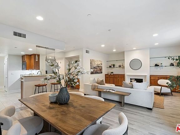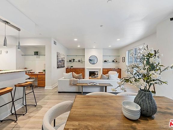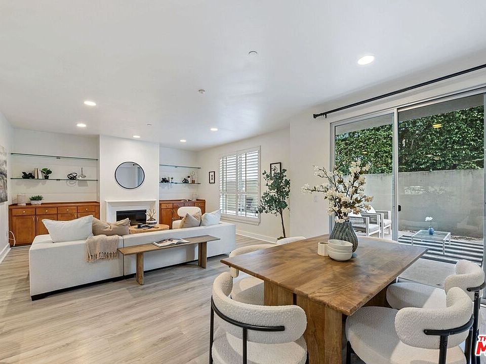 Sophisticated and spacious rear-corner unit featuring 2 bedrooms, 2.5 baths, and a den/office, highlighted by an expansive patio. Designed for both comfort and elegance, this single-level home offers an open floor plan with high ceilings, recessed lighting, plantation shutters, and beautiful flooring throughout. The living and dining areas flow seamlessly to the oversized patio and are enhanced by custom built-ins and a cozy fireplace, creating an inviting indoor/outdoor setting perfect for entertaining or relaxation. The gourmet kitchen is a chef's delight, complete with granite countertops, a breakfast bar, and stainless-steel appliances. The large primary suite also opens to the patio and includes a custom walk-in closet and a luxurious bathroom with dual vanities, a soaking tub, and a separate shower. The spacious second bedroom features its own en-suite bathroom. Additional highlights include a built-in desk, powder room, in-unit washer/dryer, and central A/C & heat for year-round comfort. The contemporary 2003 building offers two separate parking spaces, extra storage, and guest parking. Ideally located near Century City, Rancho Park Golf Course, Westfield Century City, and Beverly Hills.