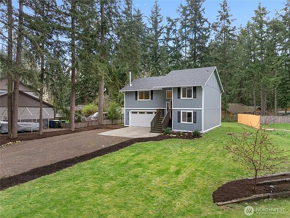 A stunning sanctuary in coveted Clearwood, this wonderful 3 bed, 2 bath oasis is nestled among old growth forest where you can truly enjoy a peaceful, laid-back life in a secure gated community. Designer touches throughout this home include a stylishly updated kitchen and spa-like bathrooms, custom lighting and fixtures, and a brand-new ductless system for year-round comfort. The property boasts a HUGE flat yard and a ton of parking, and is situated on a quiet cul de sac. Clearwood features lakes with great fishing, 6 beaches, a giant heated pool, sport courts, playgrounds, docks, private boat launch, and 13 MILES OF TRAILS! Time to come home and discover the good life in the Pacific Northwest.