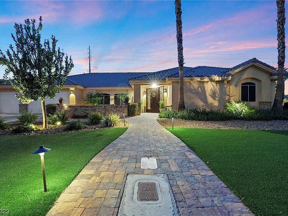 BOM! Embrace luxury and convenience!Nestled in a gated cul-de-sac on over ½ acre. A low-maintenance front yard graced with a charming patio and vibrant lemon/lime trees. Step into the backyard, an entertainer's haven, where gatherings await. Pool, fire pit, built-in pizza oven, and retractable solar shades for any occasion. Raised garden beds w/separate watering=harvest. Lovely lighting illuminates the property! Inside, spacious bedrooms, lovely bathrooms, and dedicated guest quarters await. Unleash your culinary creativity in the chef's kitchen, complemented by two living areas for cozy conversations and game nights. A breakfast bar brings all together! New shutters throughout enhance privacy and style. Newer AC units/water heater, paired with solar panels demonstrate environmental stewardship. Central to Las Vegas's vibrant attractions, this custom home seamlessly blends delight, privacy, and comfort. Schedule a showing today and experience the surroundings of your dreams.