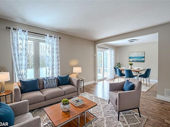 ***SOLD FIRM,AWAITING DEPOSIT*********** TURN-KEY ALL-BRICK BUNGALOW NESTLED ON A TRANQUIL 1-ACRE LOT! Peacefully set on a sprawling 1-acre lot surrounded by mature trees, this beautifully maintained all-brick-raised bungalow offers exceptional privacy. Fantastic curb appeal is highlighted by landscaped front garden beds and a paved driveway with 12 parking spaces leading to an attached double garage with storage shelving and a workbench. Step inside to nearly 2,100 sq ft of finished living space, where an open-concept dining and living area flows seamlessly into the stylish kitchen, featuring dark cabinetry, a modern tiled backsplash, and stainless steel appliances. A walkout leads to an incredible backyard oasis, complete with a spacious multi-tiered deck, pergola-covered lower deck, patio area, two sheds, and a gazebo, ideal for entertaining or unwinding in nature. Additional outdoor highlights include a small pond, a fire pit area, garden beds, a clothesline, and a hot tub pad with an electrical hookup. The main level features a spacious primary bedroom with a walk-in closet, a 3-piece ensuite, and a convenient laundry room with storage cabinets, a laundry sink, garage access, and a walkout. The bright, finished basement extends the living space with a large rec room featuring a cozy propane fireplace, two additional bedrooms, a 3-piece bathroom, and storage. This home is packed with upgrades, including app-synced perimeter security cameras, smart outdoor lighting, Bell high-speed internet, newer shingles, a newer hot water tank, a water filtration system, a UV filter and a water softener. Ideally located just 10 minutes from Coldwater and 15 minutes from Orillia’s west-end amenities, including Costco, Home Depot, and grocery stores. This exceptional turn-key property offers space, privacy, and modern conveniences!