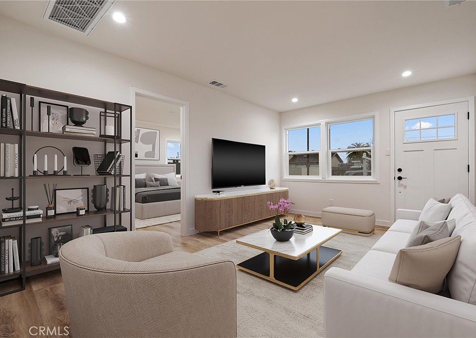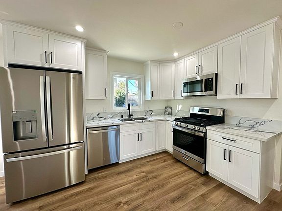 Step into a bright, open living area featuring recessed lighting that adds a warm, welcoming glow. The brand-new kitchen steals the spotlight with its sleek white shaker cabinets, polished quartz countertops, and modern appliances—perfect for both everyday living and entertaining. Freshly painted walls and new floors flow effortlessly throughout, giving the entire home a crisp, modern vibe.