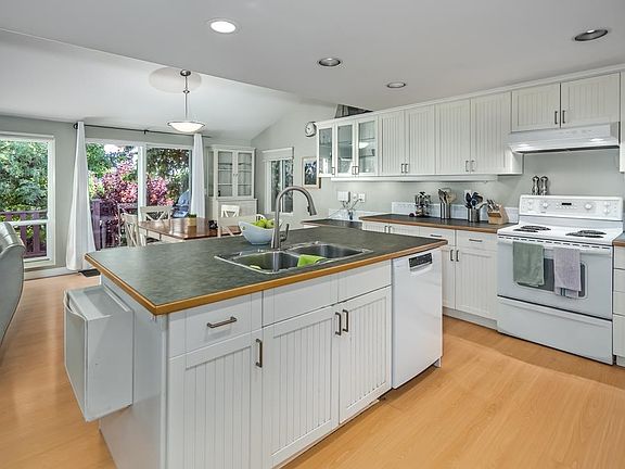 An excellent family home on a gorgeous 11360 sqft lot! Amazing private backyard w/ park like setting and tons of room for kids to play! Enjoy mature trees and hedges for ultimate privacy + plum, pear, apple trees! This 2425 sqft home has a great layout starting w/ open concept kitchen, loads of counter/cabinet space and open to dining/living area. Great natural light throughout! 3 bed + a den on main floor + full bath! Large Basement has separate entry and is set up for in law suite! Massive utility/storage room w/ separate access. Mountain views off the back deck! Double garage w/ newer door, Roof done 2008 and just professionally cleaned/treated, driveway sealed 2025, new deck boards, NEW AC and Furnace! Central location, minutes to grocery, restaurants HWY 1, trails, parks + more!