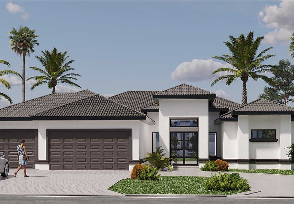 Under Construction-Waterfornt Single Family Residence located in NW Cape Coral. Spaciously designed 3/3/3 with den/office will feature a 14'4 impact double door entry, open floor plan, 9'4 coffered ceilings and imported 24x48 tile flooring throughout. The kitchen's oversized quartz waterfall island will feature an under-mount single bowl stainless steel sink, room for meals around the island, and stainless steel appliances completing the versatility of this spacious kitchen. All baths and kitchen will include quartz countertops, fit & finished with soft close drawers and cabinets, shower only and accented with pendant and wall lighting. The guest bath designed to enter onto the paved pool deck and screened lanai will conveniently serve as pool bath.