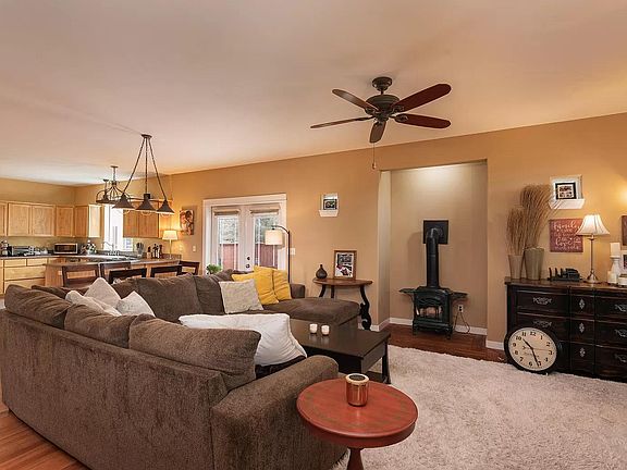 Open great room livingSitting or bbq deckWide plank wood floorsNice sized kitchenRustic lighting fixturesDouble garageLow maintenance landscaping
