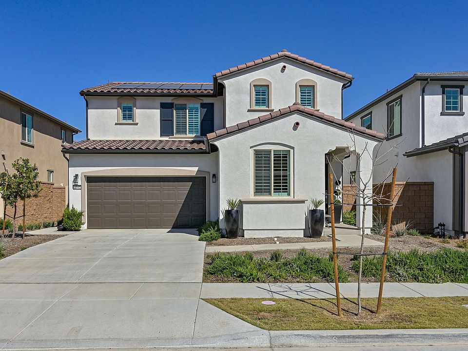 Highly upgraded 4 bedroom property in the gated community of Bedford, this spacious and modern home offers 4 bedrooms +loft and 3 bathrooms, great floorplan: a main floor bedroom and full bathroom, ideal for multi-generation family, huge family great room open to kitchen and dining space, on the second floor, generous primary suite with mountain view has dual vanities, large walk-in shower and walk-in closet, and the other two bedrooms, laundry room and big loft space with fantastic TV and sound system, creating theatre feeling at home. Lots of high quality upgrades: custom lights, elegant plantation shutter, handsome wood laminate floor, gorgeous kitchen making you chef experience, well designed and low maintenance backyard. Resort like community amenities: a Fitness Studio, Self-Serve Dog Spa, Event Lawn for Outdoor Movies, Fit Play Park, Firepit, Outdoor Lounge and 75-foot Saltwater Lap Pool with Shaded Deck Outside the community wall is the marketplace with Starbucks, Amazon Fresh, Shopping, Dining, banks, Gas & More. Easy Access to the 15 Freeway. Great schools in this area. Paid off solar panel which will reduce your electricity bill a lot. This home will not last long, so come to see soon.